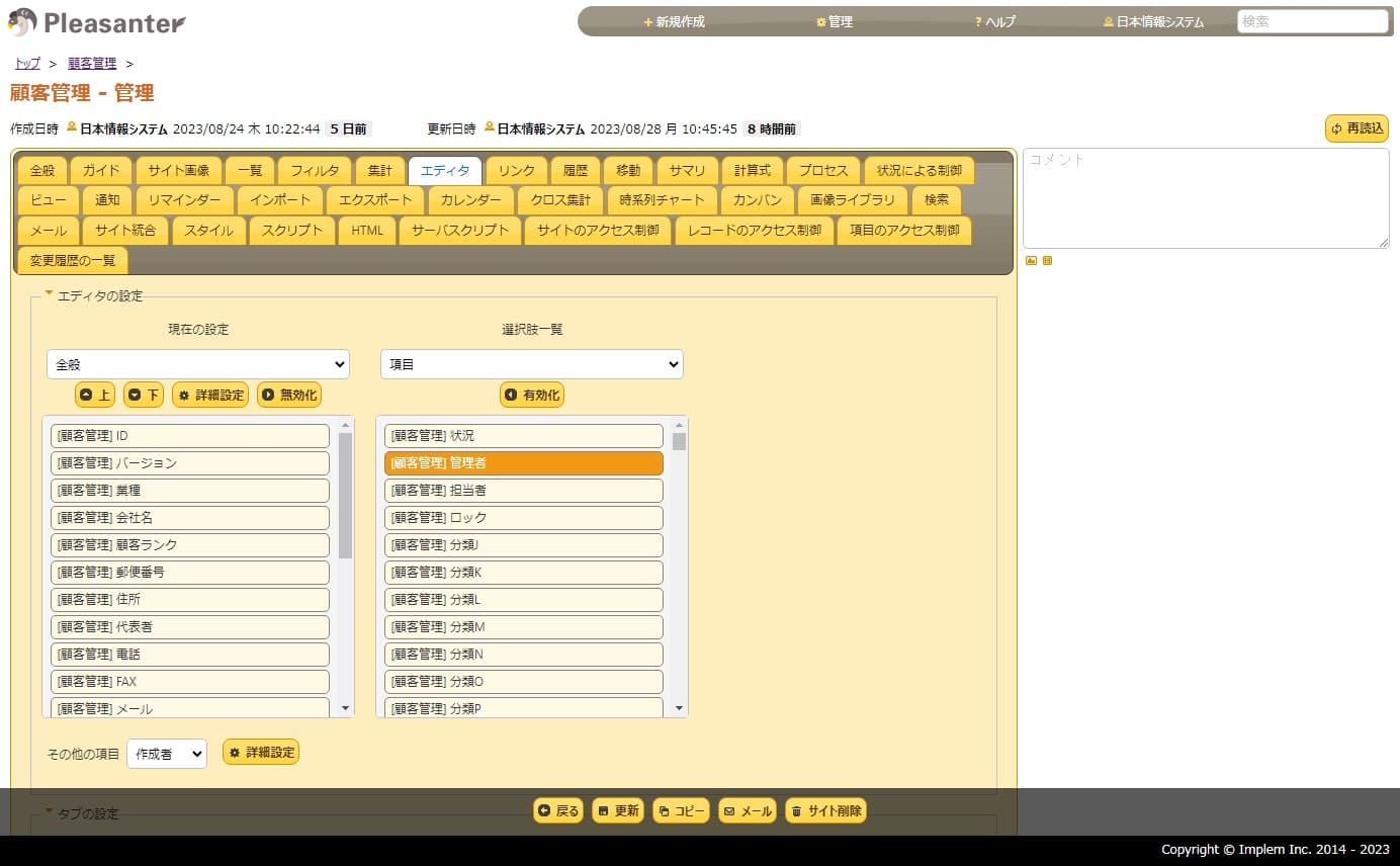 プリザンターの操作画面です。プログラムが出来なくても、マウス操作でデータベースを作成できます。